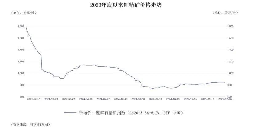 自2023年以来,受供给过剩影响,锂化工产品价格持续下行,进而导致锂精矿价格大幅回落。自2024年9月起,同花顺iFind显示的锂精矿价格逐步企稳在700至800美元/吨之间。相比之下,而在2023年12月,这一价格还在约1800美元/吨。