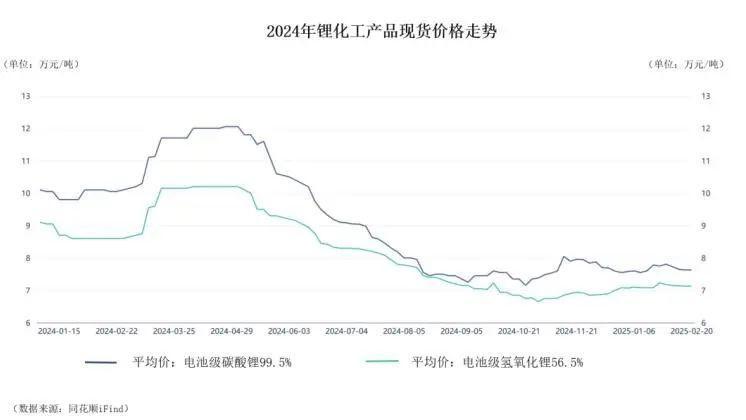 2024年碳酸锂价格进入持续下探阶段,同期氢氧化锂价格整体弱于碳酸锂,但两者走势趋同。